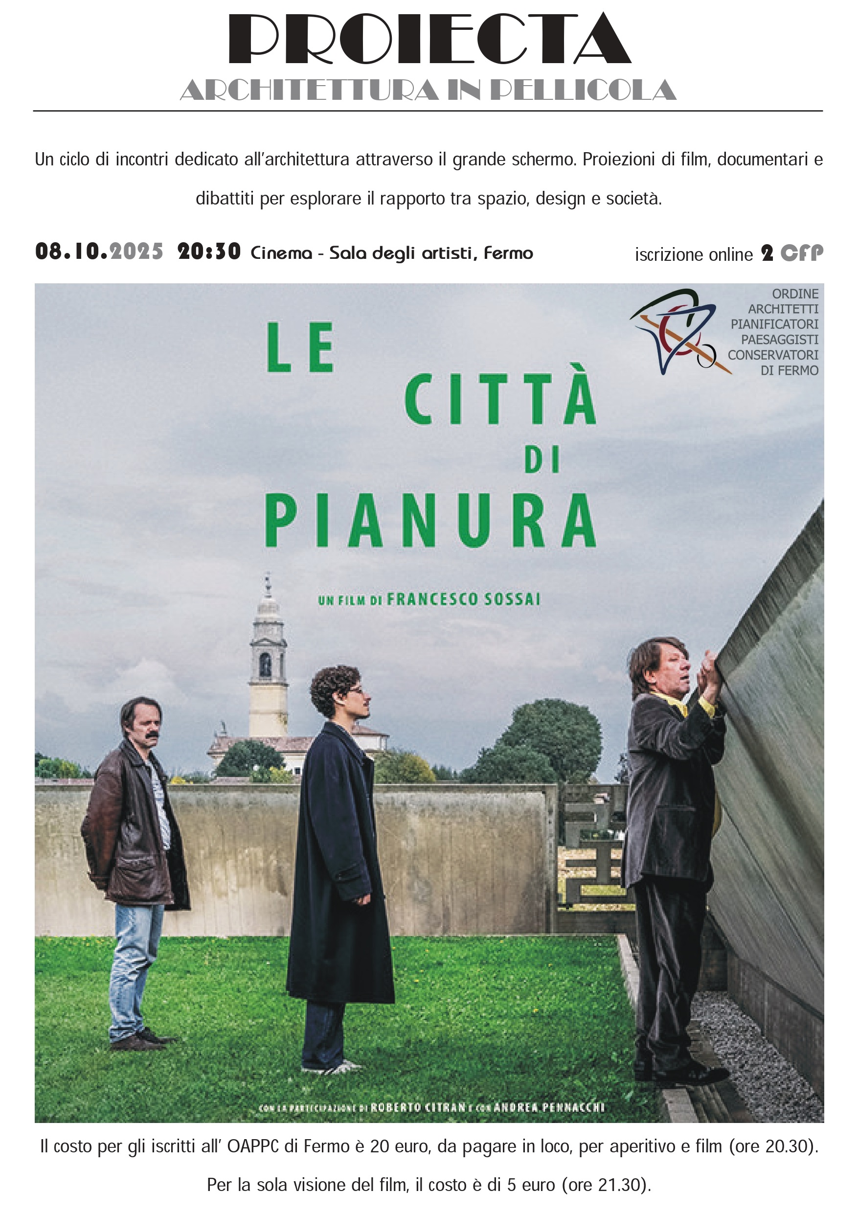 Il costo per gli iscritti all’ OAPPC di Fermo è 20 euro, da pagare in loco, per aperitivo e film (ore 20.30).